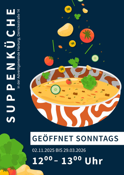 Die Suppenküche der Adventgemeinde Harburg besteht seit vielen Jahren und wurde aufgrund eines sehr kalten Winters ins Leben gerufen, da die meisten Einrichtungen dieser Art am Sonntag geschlossen sind.